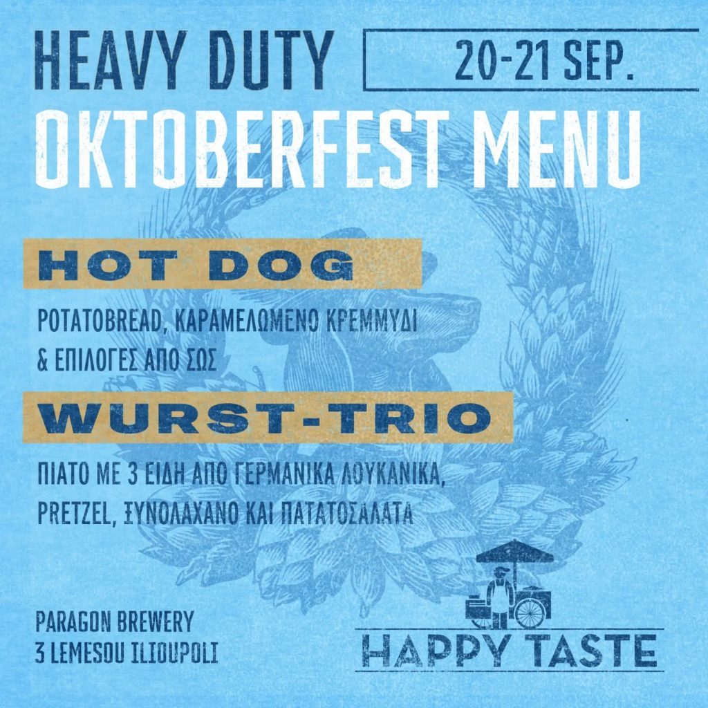 Παράλληλα, από τις 19 Σεπτεμβρίου μέχρι και τις 5 Οκτωβρίου το taproom της μικροζυθοποιίας θα είναι διακοσμημένο στα χρώματα του Oktoberfest, ενώ μερικές μέρες την Festbier της Paragon οι επισκέπτες θα μπορούν να συνδυάζουν με βαυαρικό μενού. Αρχής γενομένης το Σαββατοκύριακο 20-21 Σεπτεμβρίου, θα υπάρχουν δύο επιλογές φαγητού από την Happy Taste.