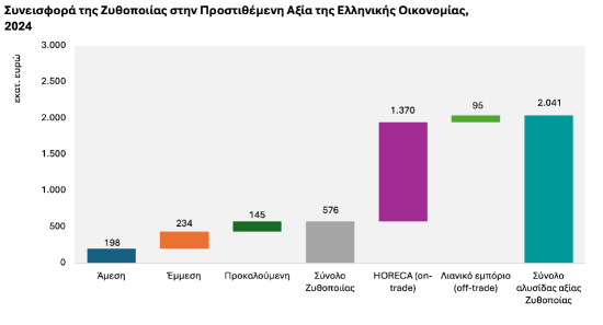 Η συνολική προστιθέμενη αξία της ευρύτερης εφοδιαστικής αλυσίδας της Ζυθοποιίας (περιλαμβάνεται το λιανικό εμπόριο και η HORECA) ανέρχεται σε 2,041 δισ. ευρώ, που ισοδυναμούν με το 0,86% του ΑΕΠ της Ελλάδας το ίδιο έτος.